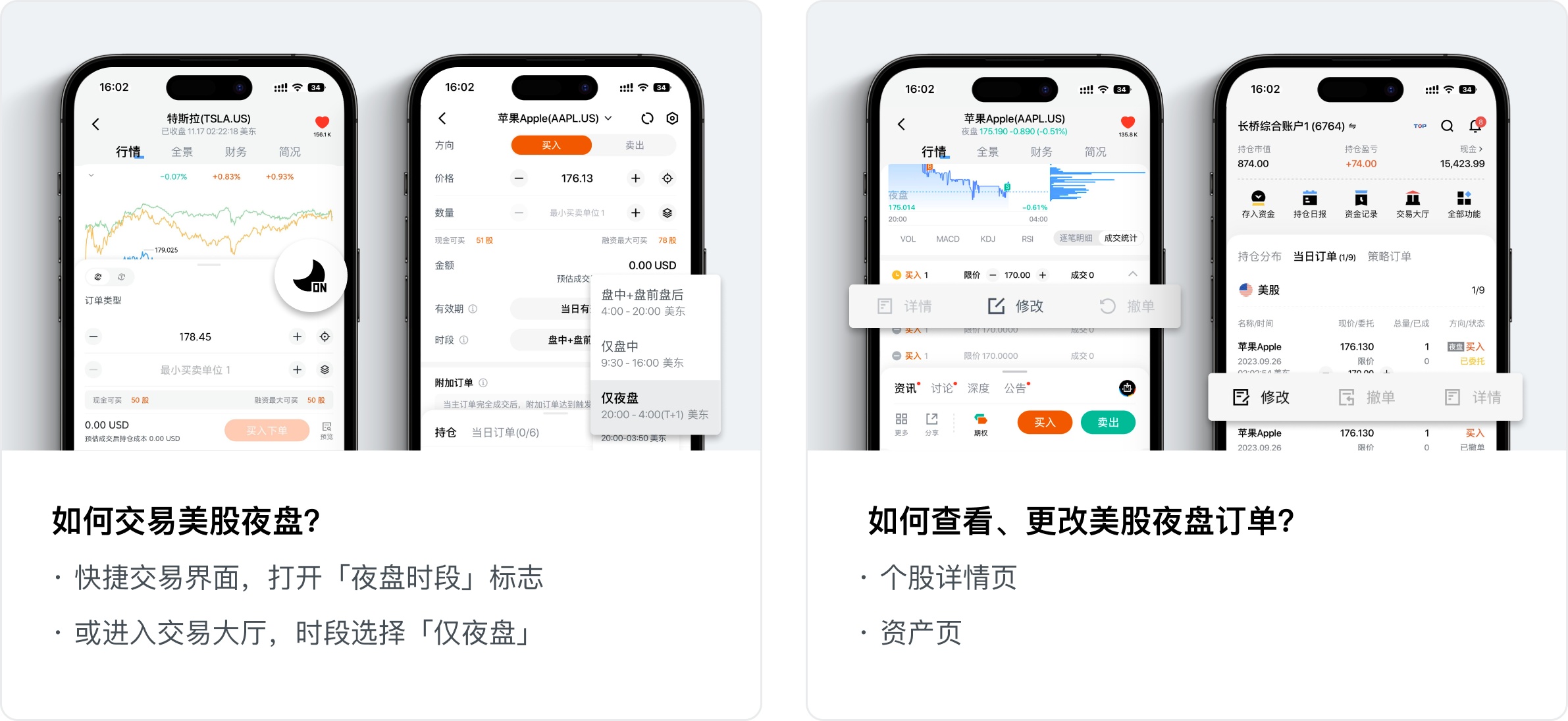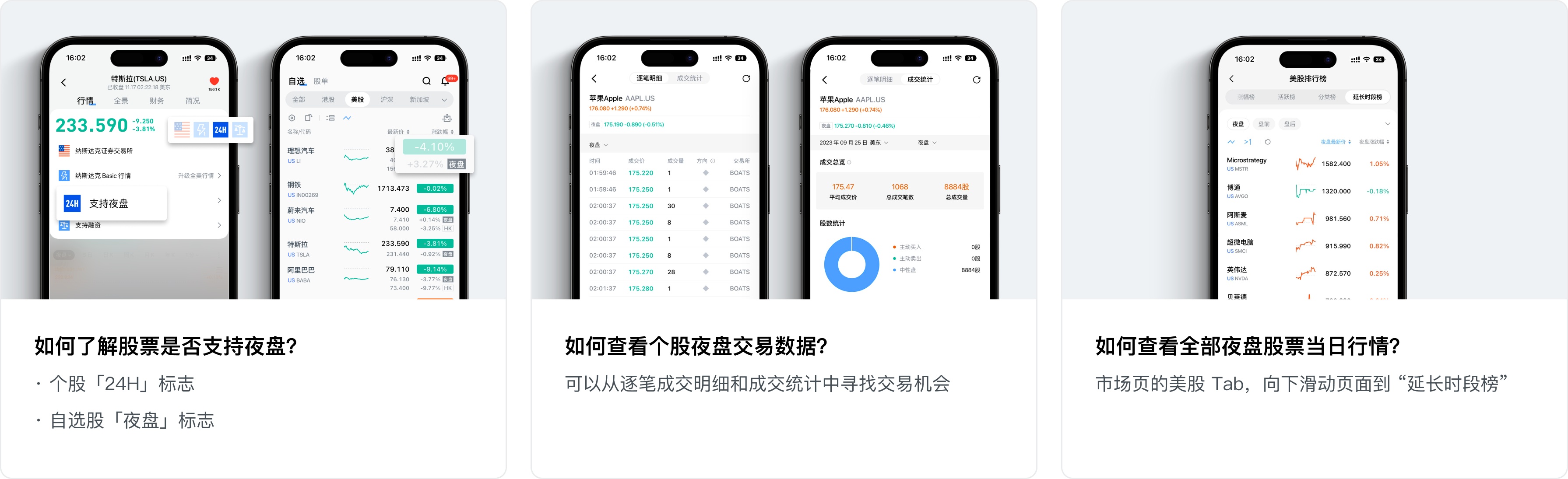 Select the stock you want to trade that supports night session, open the quick trade drawer or enter the trading hall, and make sure to select the "night session" time period: