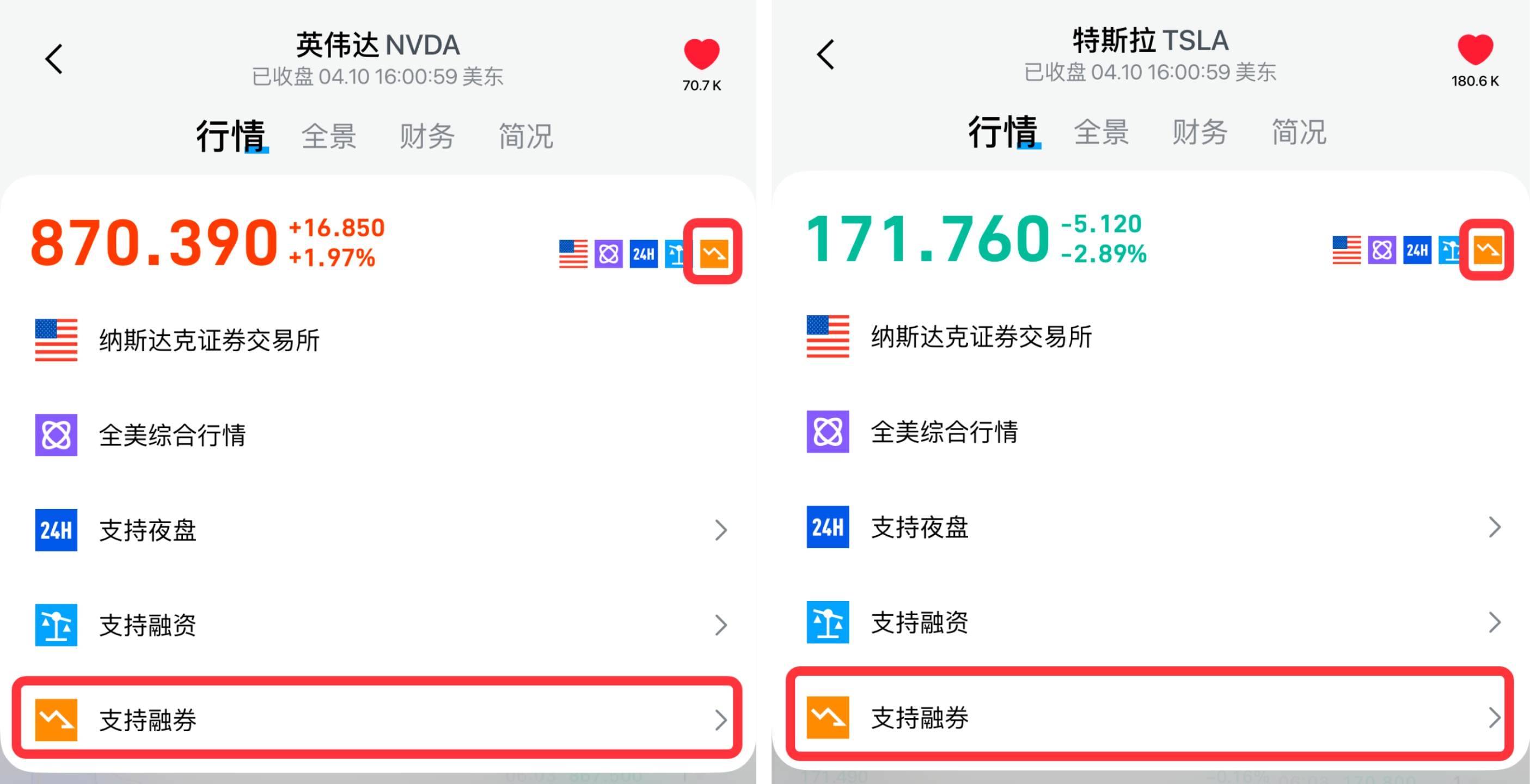 Most US stock night sessions support short selling, but you need to check if the stock details page has the "margin trading" label in the upper right corner: