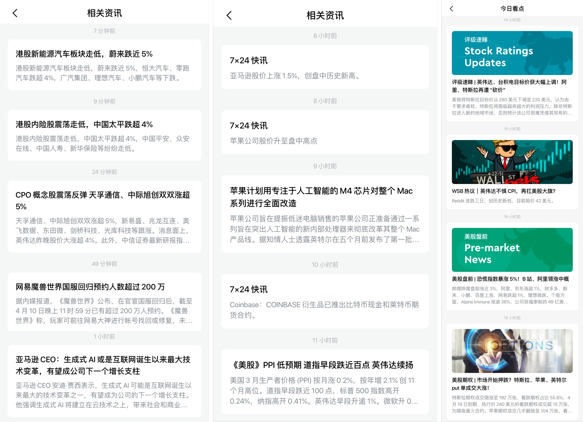 - The relevant 资讯 section will push breaking news about your watchlist and market updates to you;
