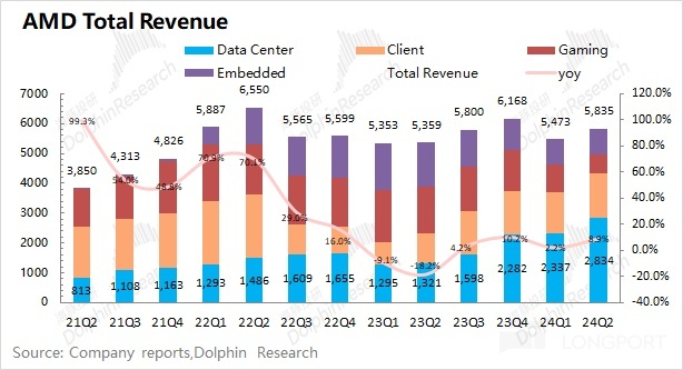 In the second quarter of 2024, AMD achieved revenue of $5.835 billion, an 8.9% year-on-year increase, slightly better than market expectations ($5.72 billion). On a quarter-on-quarter basis, the company's revenue has rebounded, mainly driven by the growth in the data center business.
