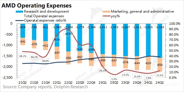 In the second quarter of 2024, AMD's operating expenses were $2.233 billion, a 12.2% year-on-year increase, with an increase in expenses on a quarter-on-quarter basis.