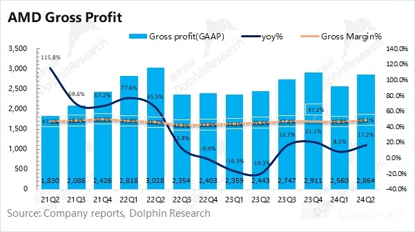 In the second quarter of 2024, AMD achieved a gross profit of $2.864 billion, a 17.2% year-on-year increase. The growth rate of gross profit exceeded that of revenue, mainly due to an increase in gross profit margin.