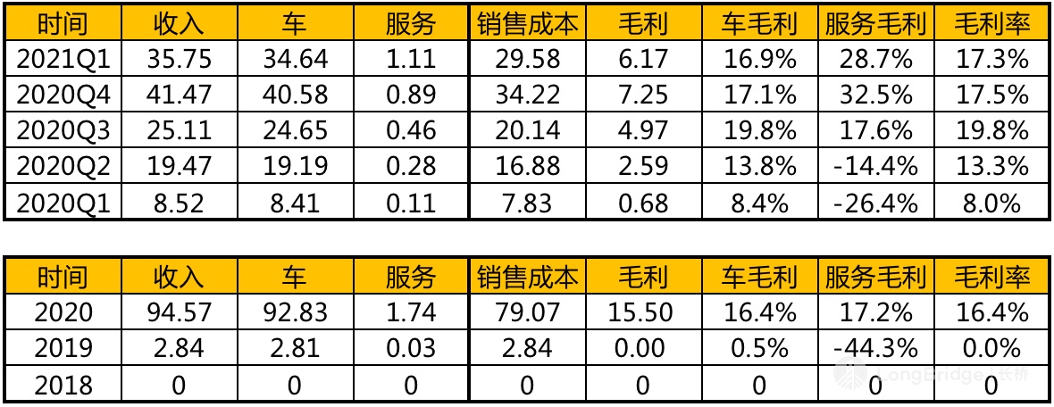 目前收入 95% 以上都来自于车辆销售,整车毛利率 17% 左右。如果按今年 9 万台的销售量来预估,今年收入预计在 260 亿左右,相对去年同比增长 174%。