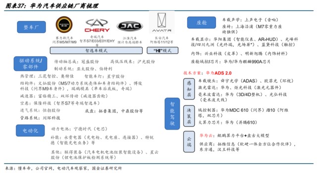 国金指出,下游整车和品牌商一旦竞争格局出现变化,整个上游供应链将全面洗牌。其中,华为系智驾领跑&市场表现火热,包括赛力斯汽车、奇瑞、江淮、北汽、长安在内的华为供应链将率先获益。