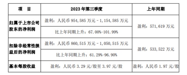 今年三季度,比亚迪的归属于上市公司股东的净利润区间在 95.46 亿元-115.46 亿元,同比大幅增长 67%-102%,利润增速甚至超过了销量增速。
