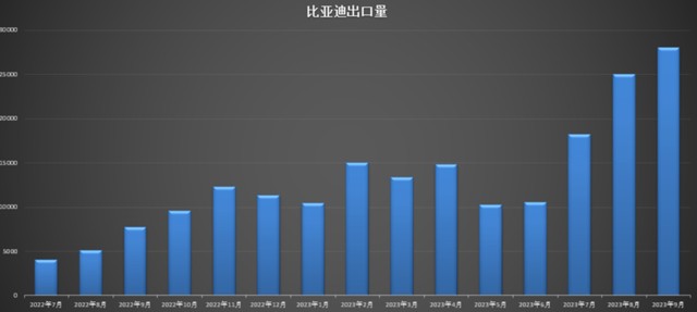 这个不利局面却在第三季度得到了明显逆转,从 7 月份开始,比亚迪的海外出口就彻底进入爆发周期,不仅拿下了泰国、新加坡、巴西和瑞典等多个国家的纯电动车型的销量冠军,并且在出口量水平上更是连续突破 2 万辆和 2.5 万辆大关,整体的基数水平虽然相较其比亚迪在国内的销量还是较低,但是出口量整体的增长趋势已经凸显。
