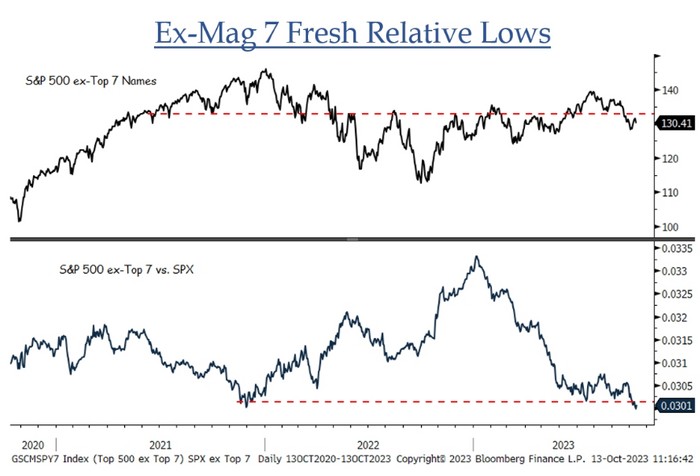 宏桥信托投资集团( BTIG)的首席市场技术分析师 Jonathan Krinsky 强调,不包括 “科技七巨头” 的标普 500 指数最近触及了今年的最低水平,而不包括 “科技七巨头” 的标普 500 指数与整个指数的比率已降至 2021 年底以来的最低水平。