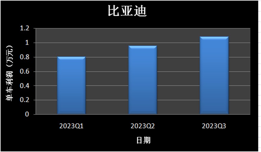 除此之外,比亚迪的单车利润在第三季度成功突破万元大关(由于比亚迪一季度和三季度没有详细的业务拆分,这里通过去掉比亚迪电子的利润来折算比亚迪的汽车利润),从今年第一季度的 0.8 万元,增长到第二季度的 0.95 万元,最终在第三季度达到 1.08 万元,同比增长 11.34%,环比增长 13.68%。