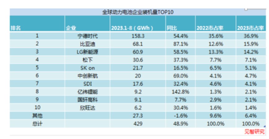 而在全球的动力电池市场,比亚迪同样表现不俗,随着比亚迪进军海外市场的步伐逐步加快,今年 1-8 月,比亚迪以 15.9% 的市占率一举超过曾经的万年老二 LG 新能源,动力电池装机量增速更是高达 87.1%,仅次于亿纬锂能。