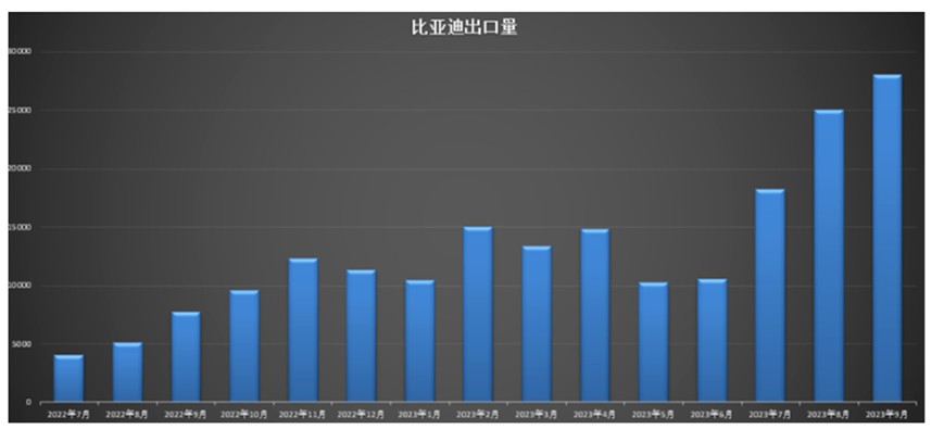 从出口量水平来看,比亚迪的月出口数量也从初期的百辆级别和千辆级别,提升至今年三季度末的 2.8 万辆,今年前三个季度,比亚迪的海外新能源汽车销量高达 14.5 万辆,占比比亚迪总销量的 7%,同比增速超 500%。