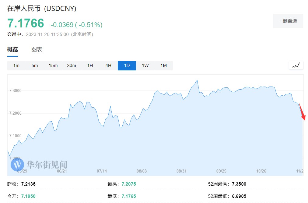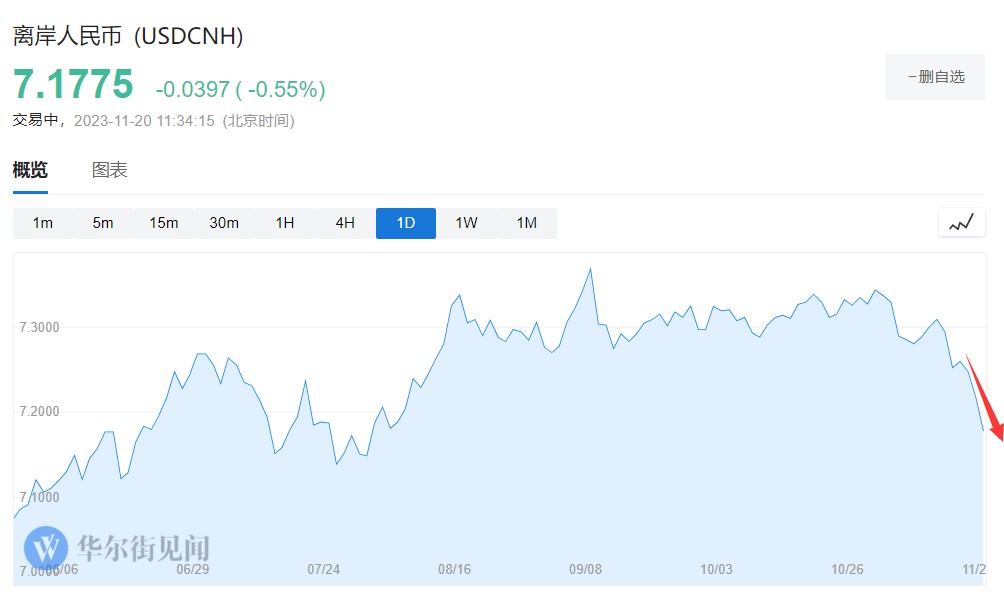 离岸人民币兑美元持续走高,现已升破 7.18 关口,刷新 8 月份来高点,日内涨近 400 点。在岸人民币也在不断走高。