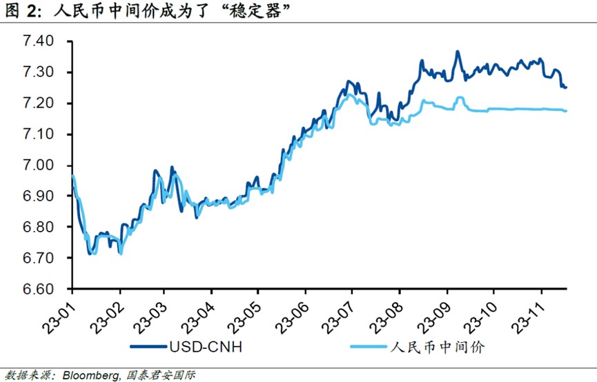 国君证券认为,人民币升值的背后,除了有美联储加息周期结束预期的外部因素支撑,还有有中间价的功劳,中间价作为汇市 “稳定器”,在做空离岸人民币成本下降的背景下,对人民币形成强劲支撑。
