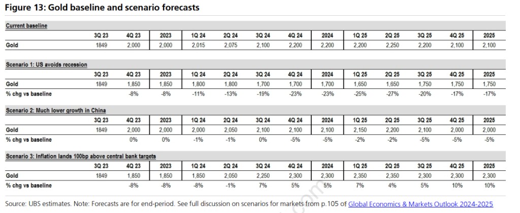 根据瑞银的基本预测,到明年年底金价将达到 2000 美元/盎司,2024 年为 2200 美元,2025 年回落至 2100 美元但维持在高位。