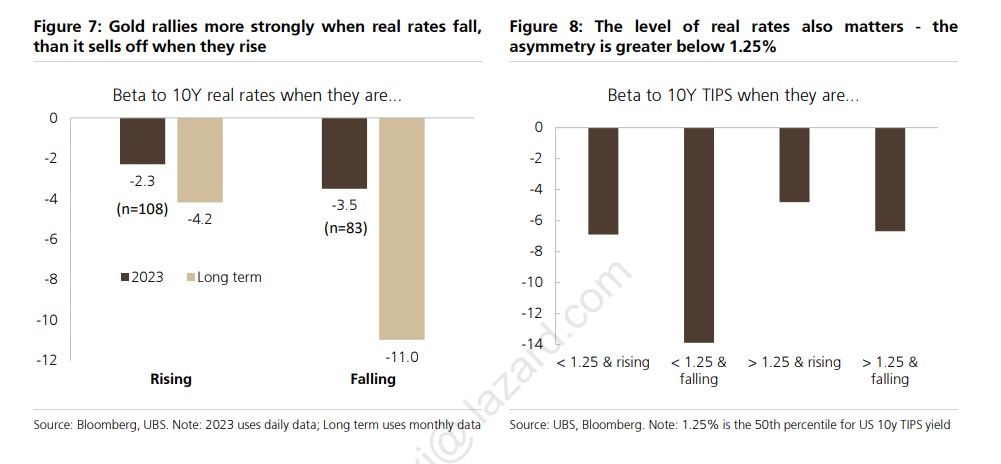 瑞银发现,10 年期美债实际利率每下降 100 个基点,黄金就会上涨 11%,但当每月涨幅相同时,黄金只会下跌 4.2%。