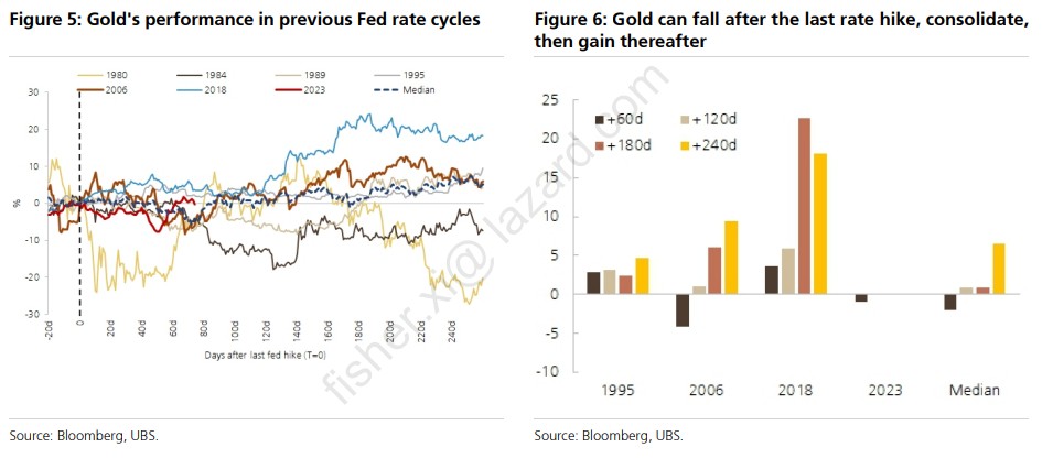 观察黄金在美联储历次加息周期后的表现,瑞银发现,在以往加息周期结束后的 3 个月左右,金价往往会下跌 2%,但在接下来的 6 个月内上涨 7%。