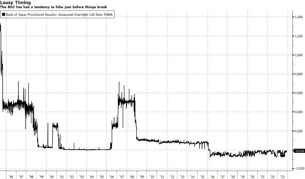 日本央行行长植田和男此前有关最快将于本月升息、结束负利率的暗示显然搅乱了市场。人们不禁会想起,日本央行历史上加息后常有倒霉事,甚至经济危机不久后就会发生,不知这次是否又会重蹈覆辙?