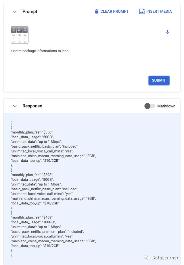 在这个测试中,我们从 HKT 官网截取了一段运营商套餐费用信息,然后使用Gemini 提取图片信息,并用 json 返回,信息提取非常准确,而且可以识别是三个不同的套餐,进而生成了一个数组,包含了三组 json: