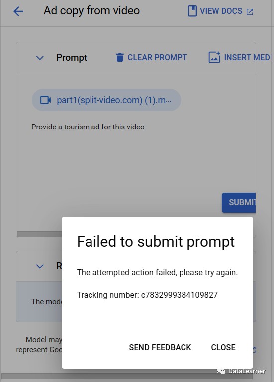 这一段测试主要是上传了几十秒的南京城市宣传片,让 Gemini 基于这个宣传片生成一份旅游广告的描述。根据官网的描述,Gemini 可以理解视频描述的是什么,里面的人有什么动作或者在做什么,甚至基于视频生成广告描述。但是,我们测试了很多次,该接口都测试失败,遂放弃。