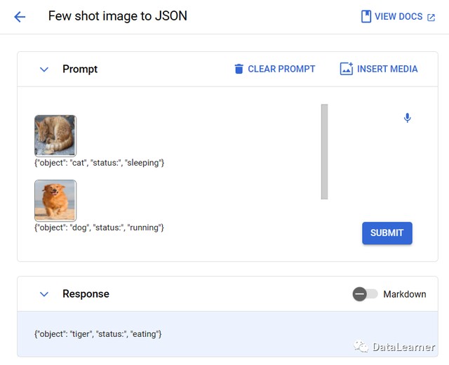 这个测试非常有意思,是一个多模态 few-shot案例。就是你先给出 2 个图文关系,每一个都是一幅图 + 一个 json 输出。相当于有 2 个示例,然后给 Gemini 一个新的图片,Gemini 可以自动理解前面的图文关系,生成新的 json 文本。在这个测试中,DataLearnerAI 先给出了 2 组图片,分别是睡觉的猫咪和奔跑的狗狗,图是 Google 截图,类似如下的输入: