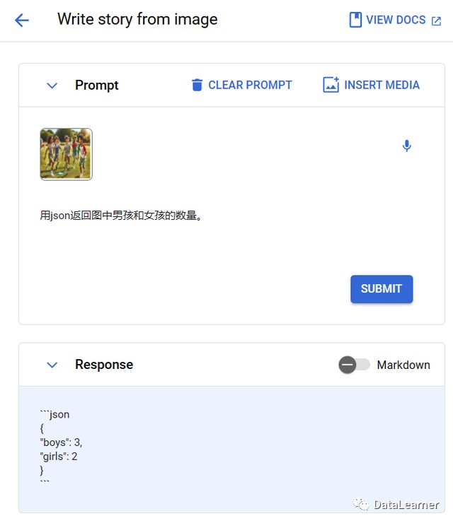 接下来,我们继续做了一个测试,输入一个图片,让 Gemini 用 json 返回图片中男孩和女孩的数量: