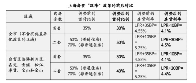 此次,上海的住房信贷政策也有所调整。上海新政提及,上海首套房首付比例调整为不低于 30%。二套房在自贸区临港新片区以及嘉定、青浦、松江、奉贤、宝山、金山 6 个行政区全域实行差异化政策,最低首付款比例调整为不低于 40%。
