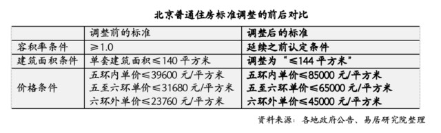 北京普通住房的标准也迎来调整,主要是在建筑面积条件、价格条件方面作出变动,包括单套建筑面积由 140 平方米以下调整为 144 平方米以下,价格标准取消了总价段限制,五环内成交单价上限由 39600 元/平方米提升至 85000 元/平方米,提升了 1.15 倍;五 - 六环成交单价上限由 31680 元/平方米提升至 65000 元/平方米,提升了 1.05 倍;六环外成交单价上限由 23760 元/平方米提升至 45000 元/平方米,提升了 89%。按照北京市住建委数据,政策调整后北京全市普宅占比提高至七成左右,将有更多家庭能够享受住房转让时的增值税优惠政策。