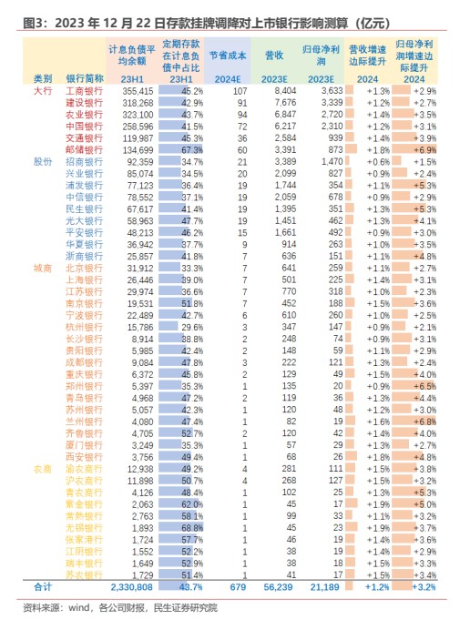 另据民生证券计算,42 家上市银行 23H1 定期存款在计息负债平均余额中占比 14.6%,假设平均置换期为 3 年,平 均调降幅度为 20BP,则将节约 679 亿元成本,对 2024 年净息差的贡献为 +3BP, 或将提振 2024 年营收增速 +1.2pct,归母净利润增速 +3.2pct。