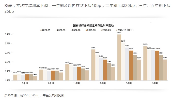 中金认为,本次 1 年以内存款下调 10bp 为 5 轮降息中首次,标志着后续存款利率曲线全面下行可能开启。由于短期存款利率罕见下调,本轮可能是 2016 年以来综合幅度最大的一轮存款利率下调。