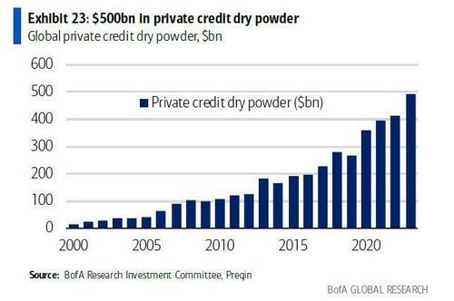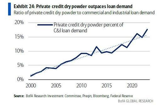 美银数据显示,2023 年,全球私人信贷市场的现金储备达到了近 5000 亿美元,比 2013 年增长了 170%。相比之下,目前商业和工业贷款需求总额为 2.8 万亿美元。