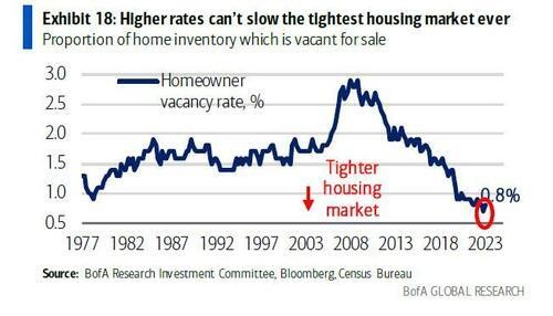 空置率也创下历史新低,表明当前是美国历史上房地产市场供需最为紧张的时期之一。美联储的政策不能直接影响住房存量,除非经济增长受到硬着陆的严重打击,否则房价不太可能大幅下滑。