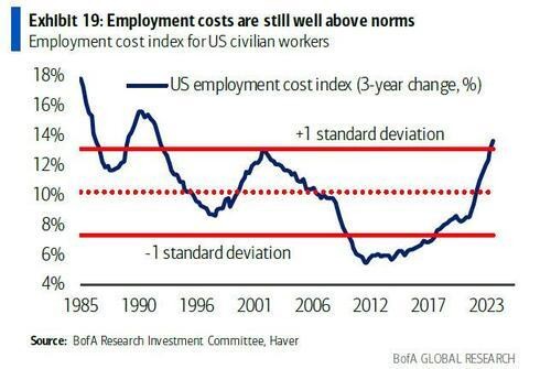 工资方面,衡量总薪酬的就业成本指数 (ECI) 自 2020 年以来上涨了 13.5%,为 1992 年以来的最大增速。