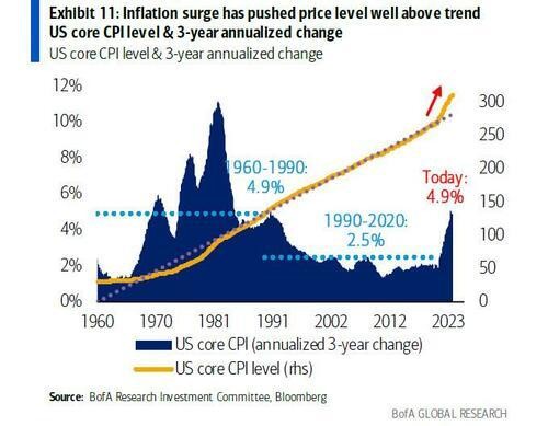 Woodard 承认,美联储四十年来最激进的加息周期有力抑制了通胀,预计通胀压力可能会在 2024 年进一步缓解,但值得注意的是,美国 CPI 三年年化增长率仍为 4.9%,这将物价水平推高至远高于六十年以来的高位水平。