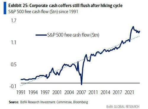 得益于强劲的私人信贷市场,标普 500 成分公司的自由现金流量尚未回落至疫情前的趋势。当前标普 500 自由现金流量为 1.4 万亿美元,比历史趋势预期高出 1000 亿美元。