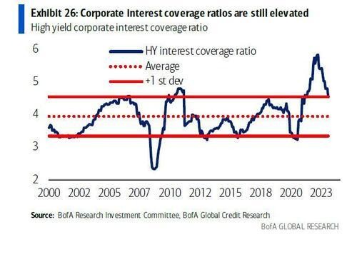 与此同时,企业现金储备几乎已重新回升至 7 万亿美元,超过了利息支出。美国高收益公司的当前利息保障比率已从疫情峰值回落,但仍高于平均水平一个标准差。