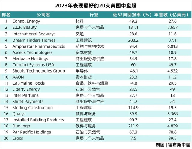 Dream Finders 往往比大盘股波动更大,特别是由于 Zalupski 持有该公司的大部分股份,其流通股相对较低,但投资者在小盘股中承担更大风险的同时也有机会获得更高回报。中盘股榜单上的其他一些股票都是知名品牌,比如排在第 20 位的卡骆驰(Crocs),排在第 57 位的连锁餐厅 Texas Roadhouse,以及排在第 75 位的 Abercrombie & Fitch。Abercrombie & Fitch 在 2023 年迎来了复兴,突破了 2000 年代中期的历史高点。除了最精明的投资者,其他大多数人可能对它们都不熟悉,但有些上榜者可能是代表下一代股市领导者的彩票。