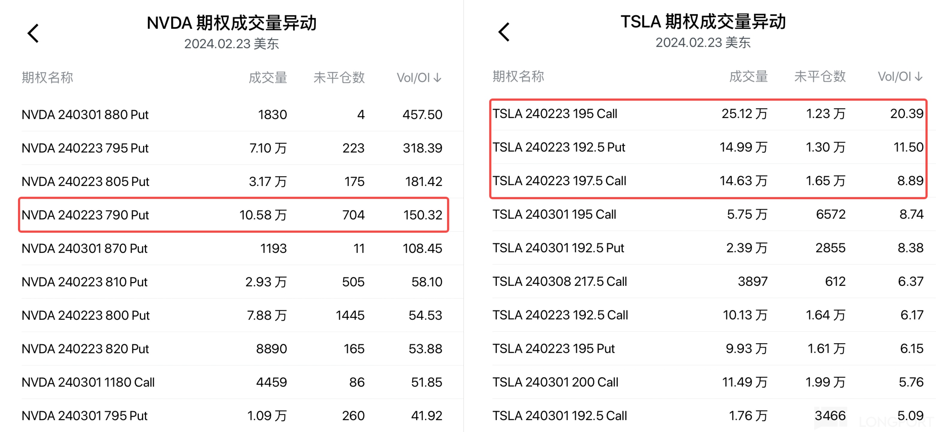 特斯拉跌近 3%,期权成交涨至 220 万张,看涨期权占比 66%。当日到期、执行价 192.5 美元的看跌期权成交 15 万张,3 月 1 日到期、执行价 200 美元的看涨期权成交超 11 万张。