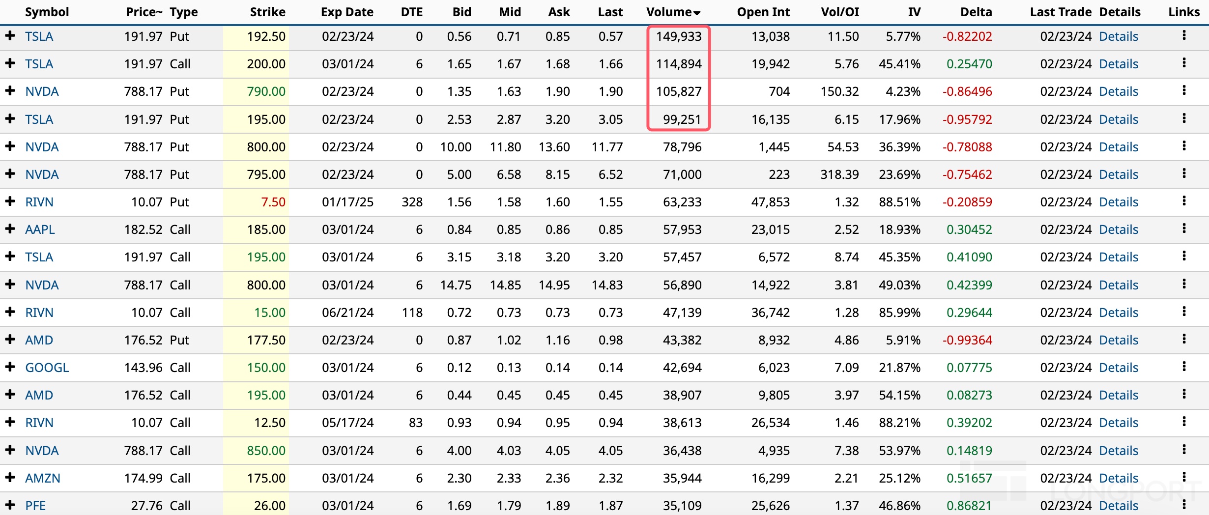 上周五最火合约:当日到期、执行价 192.5 美元的特斯拉 put,成交 15 万张!Rivian 股价大跌 12%,期权成交 77 万张;超微电脑大跌 12%,期权成交维持在 58 万张左右;Carvana 大涨 32%,期权成交暴涨至 56 万张。