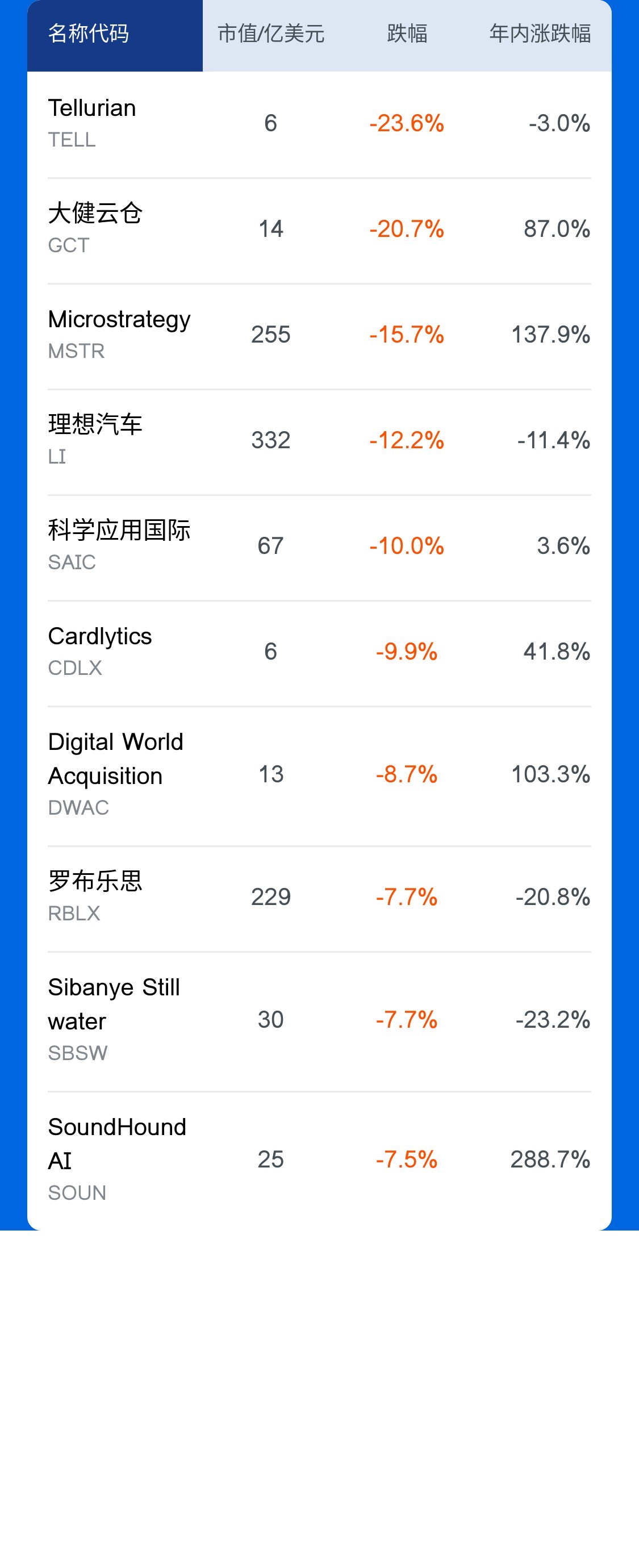 Tellurian(TELL) 跌 23.61%,成交额 5174.3 万美元,年内累计跌 3%。 大健云仓 (GCT) 跌 20.72%,成交额 3.0 亿美元,年内累计涨 87%。 Microstrategy(MSTR) 跌 15.69%,成交额 71.2 亿美元,年内累计涨 137.9%。