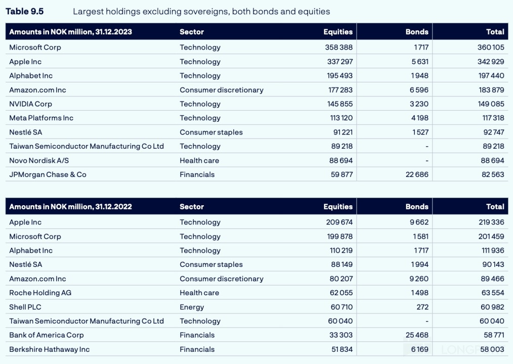 如果没有减持,那么英伟达成为了挪威主权财富基金的第三大持仓股(超过亚马逊和谷歌,仅次于微软和苹果),价值超过 2800 亿挪威克朗(约 260 亿美元)。