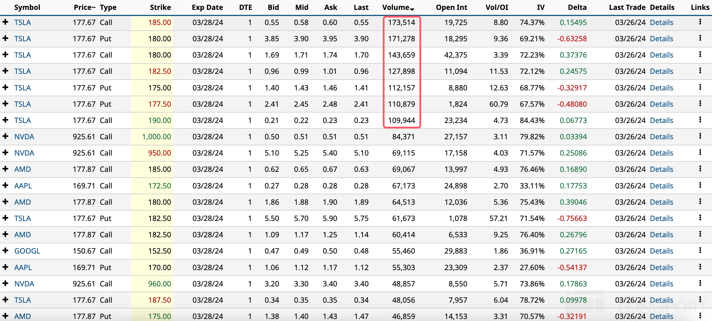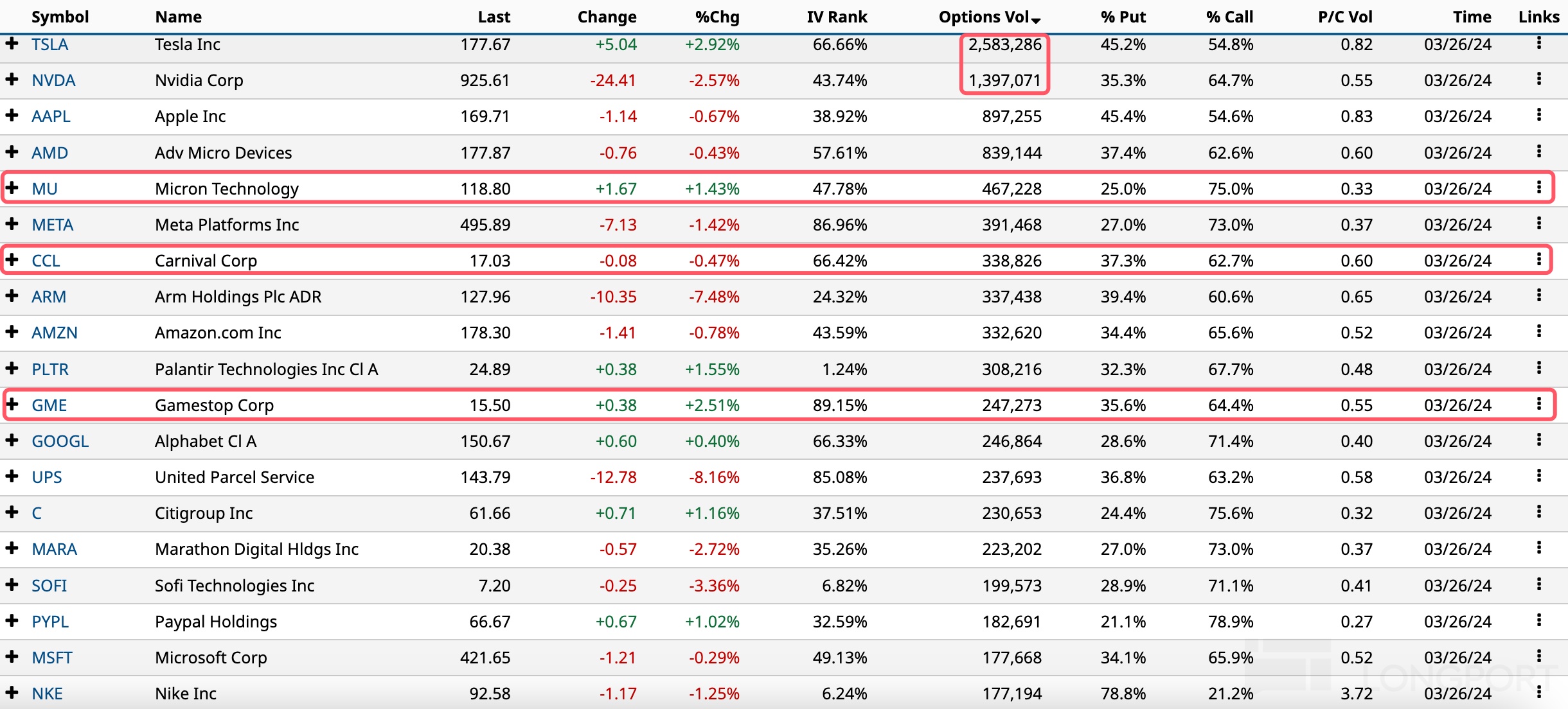 隔夜前七大最火合约全是特斯拉:3 月 28 日到期、执行价 185 美元的看涨期权和执行价 180 美元的看跌期权均成交超 17 万张。嘉年华邮轮、ARM 期权成交均暴涨至 34 万张,游戏驿站 GME 期权成交暴涨至 25 万张。