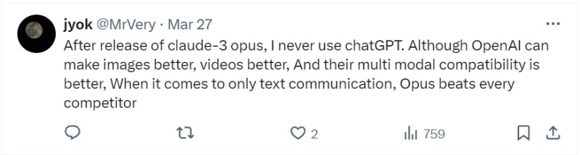 “自从有了 Claude 3 Opus,我再也没有用过 ChatGPT。”