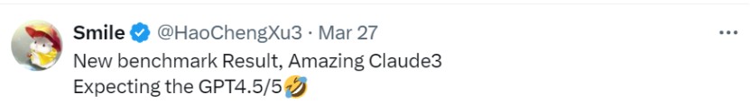 另外,Claude 3 Opus 和 GPT-4 之间的分数非常接近,而且 GPT-4 已经问世一年了,预计今年某个时候会出现更强大的 GPT-4.5 或 GPT-5。