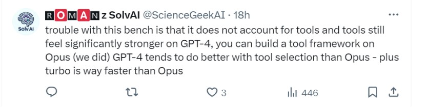 但也有人指出,Chatbot Arena 并没有考虑到添加工具后的表现,这恰恰是 GPT-4 的强项。