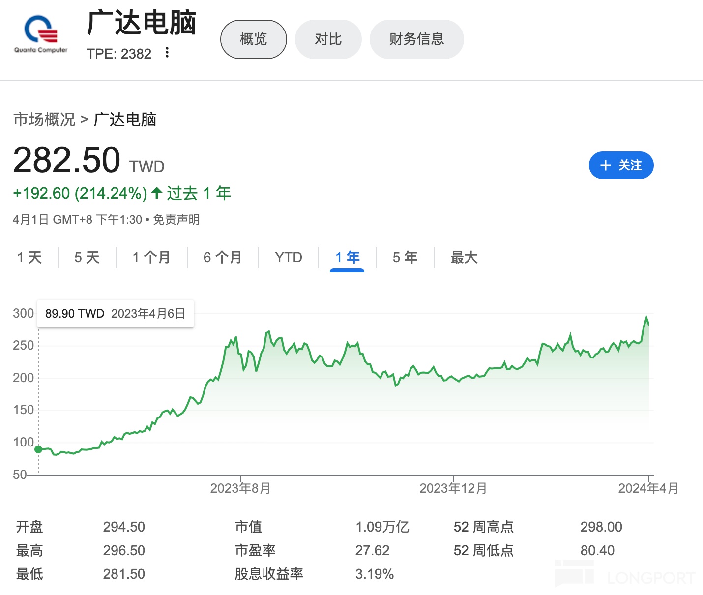 台股半导体方面,除了台积电涨幅较大外,鸿海近一个月涨幅近 50%,二者均有美股 ADR,而近一年涨幅最大的为广达电脑,近一年涨幅超 2 倍: