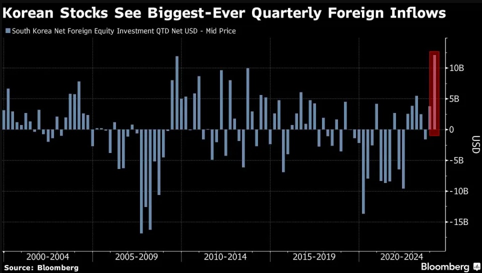 值得一题的是,一季度,外资流入韩国等股市较多,海外投资者净买入了 122 亿美元的韩国本地股票,其中半导体公司最受欢迎,如三星电子(吸引了 41 亿美元流入)和 SK 海力士(吸引了 13 亿美元)。