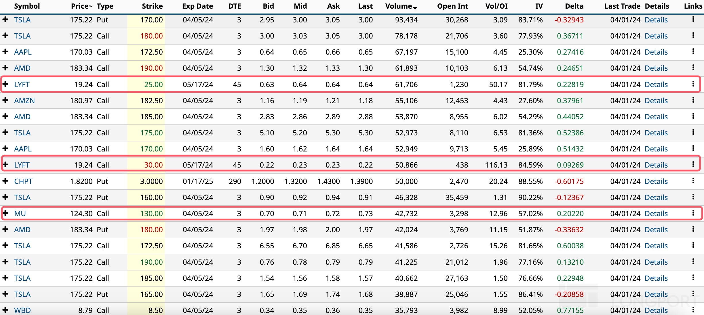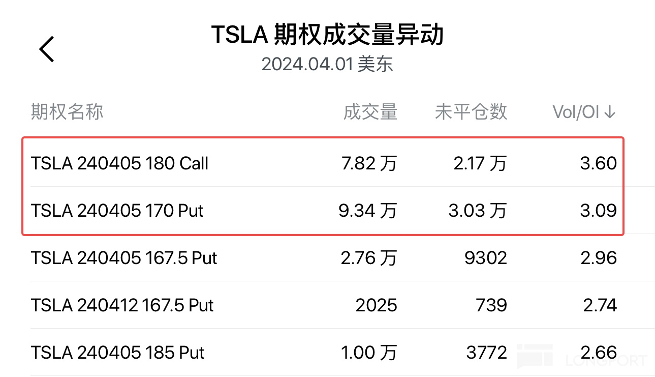 特斯拉微跌,期权成交回落至 130 万张,看涨期权占比 53%。4 月 5 日到期、执行价 170 美元的看跌期权成交超 9 万张,执行价 180 美元的看涨期权成交近 8 万张。