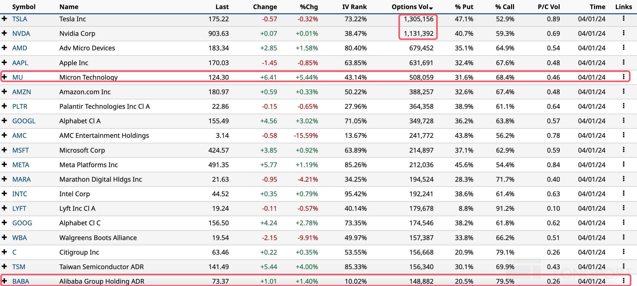 隔夜最火合约:4 月 5 日到期、执行价 170 美元的特斯拉 put,成交超 9 万张。美光科技期权成交翻倍至 51 万张,看涨期权占比 68%。阿里期权成交大涨至 15 万张,看涨期权占比 79.5%。