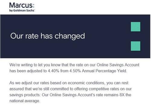 上周三,高盛旗下消费银行 Marcus 三年多来首次降低了其高收益储蓄账户的利率,将该银行旗舰产品的年利率下调至 4.4%,低于 3 月份时的 4.5%。这是自 2020 年 11 月高盛将旗下产品的利率从 0.6% 下调至 0.5% 以来的首次降低。