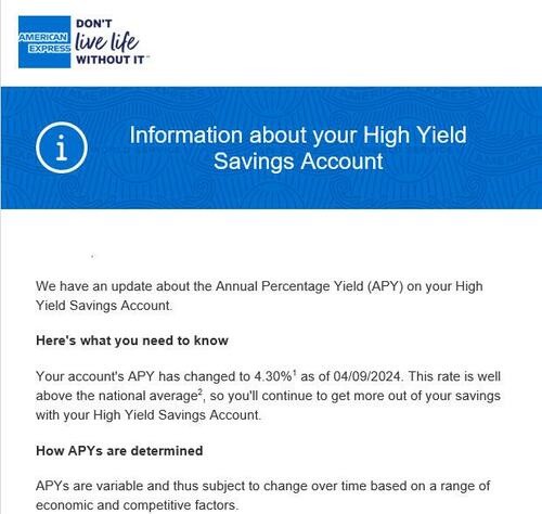 无独有偶。本周,另一家金融巨头美国运通也做了同样的事情,从 4 月 9 日周二开始,将其高收益储蓄账户的利率从 4.35% 下调至 4.30%。美国运通同样指出,该利率远高于美国全国的平均水平,可以使储户享有更高的收益。