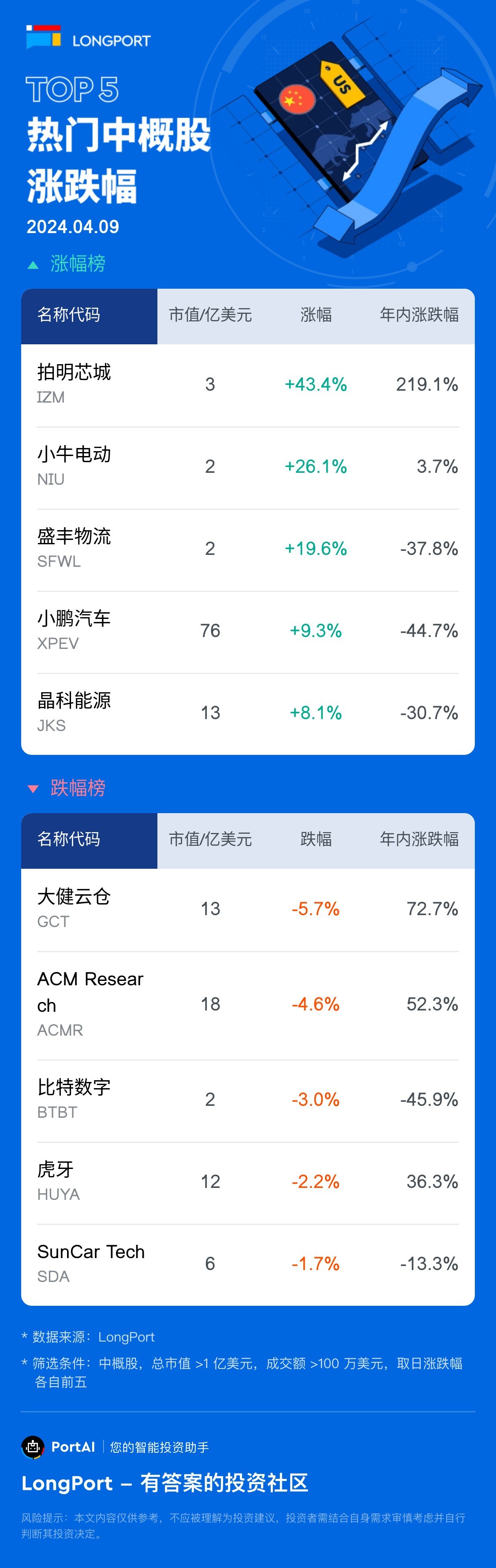 拍明芯城 (IZM) 涨 43.45%,成交额 3943.1 万美元,年内累计涨 219.1%。 小牛电动 (NIU) 涨 26.11%,成交额 391.6 万美元,年内累计涨 3.7%。 大健云仓 (GCT) 跌 5.67%,成交额 6561.2 万美元,年内累计涨 72.7%。 ACM Research(ACMR) 跌 4.58%,成交额 3840.3 万美元,年内累计涨 52.3%。